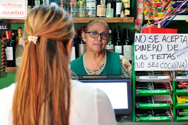 Matilde Aveiro es la dueña de un mini super mendocino que se canso que varias de sus clientas traían guardado en sus corpiños y puso el explícito anuncio: "No se acepta dinero de las tetas (no sea cochina)".