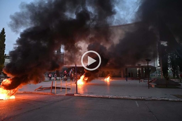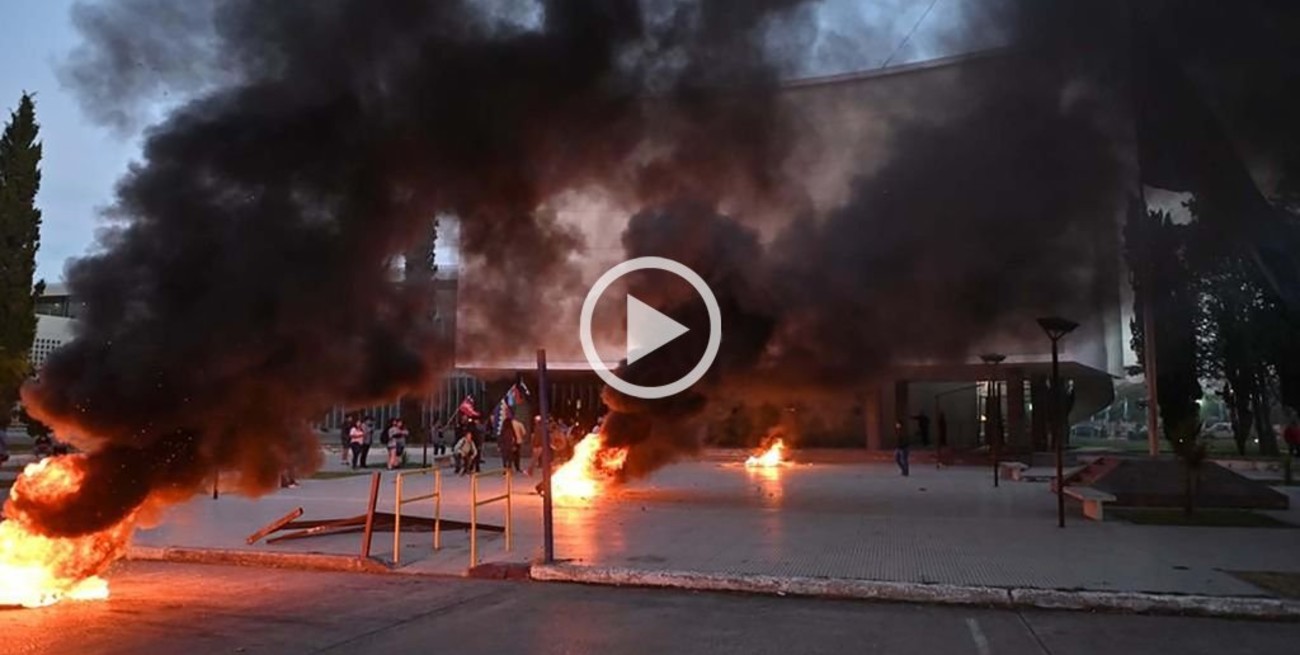 Por la tarde, manifestantes generaron destrozos en la Casa de Gobierno ubicada en Rawson y prendieron fuego en el interior del edificio. Hay enfrentamientos con la Policía.