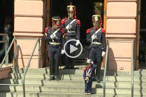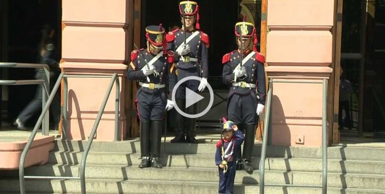 En una de las tradicionales marchas de los Granaderos sobre la Plaza de Mayo, frente a la Casa Rosada, un niño sorprendió a todos por estar vestido como uno de ellos y marchar junto a la formación.