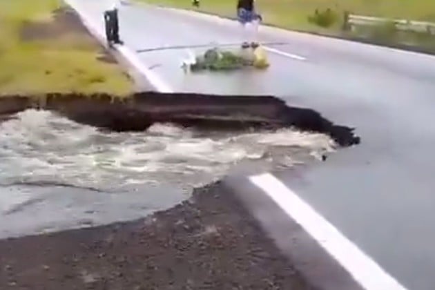 De acuerdo con la información aportada por usuarios de esa ruta, la alcantarilla que se encuentra en el lugar es más chica que la anterior y las abundantes precipitaciones de las últimas horas hicieron subir el nivel del agua hasta alcanzar la infraestructura vial, que finalmente cedió.