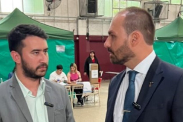 El diputado de la Libertad Avanza (LLA), Nahuel Sotelo, emitió su voto este domingo por la tarde en una escuela de la localidad bonaerense de Ramos Mejía donde estuvo acompañado por el diputado federal referente del Partido Liberal brasileño (PL), Eduardo Bolsonaro, hijo del expresidente Jair Bolsonaro, y por el legislador brasileño Rodrigo Badalares. El hijo del exmandatario de Brasil llegó hoy al país y contó a la prensa que previo a acompañar a Sotelo, asistió a un almuerzo con la candidata a vicepresidenta de LLA, Victoria Villarruel y la candidata a diputada por esa misma fuerza, Diana Mondino, al cual también asistieron, según refirió, diputados de Uruguay, Perú y Colombia así como referentes del partido ultraconservador español VOX.