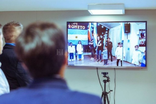 A más de 3.200 kilómetros de Buenos Aires y con temperaturas bajo cero, la ceremonia se celebró hoy a las 11 de la mañana y estuvo a cargo de Mariana Ibarra, una docente nacida en Buenos Aires de 37 años que, además es la directora de la escuela y madre de Juan Ignacio.