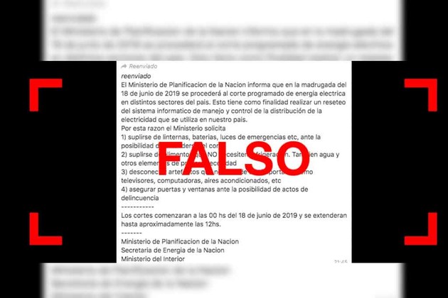 Luego del apagón a nivel nacional que afectó a casi todo el país, parte de Uruguay y el sur de Brasil el domingo 16 de junio, el lunes último por la noche comenzó a circular por redes sociales y grupos de WhatsApp un supuesto comunicado del “Ministerio de Planificación de la Nación” que anunciaba un nuevo corte de luz desde la madrugada hasta el mediodía de este martes. En el mensaje, además, se recomendaba a los usuarios tomar algunas medidas y precauciones. Sin embargo, este contenido es falso.