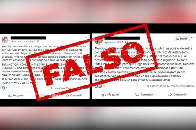 Circula por WhatsApp y Facebook un texto que afirma: “Desde mañana los seguros no van a cubrir las pólizas de autos por cualquier siniestro que suceda violando el decreto de aislamiento. Sino puede justificar el motivo por el cual circulaba, no lo va a cubrir por ser falta grave del asegurado (sic)”. Todo esto es falso.