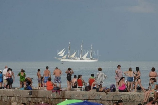 En su primer vista por el playón de Playa Grande la banda musical del Área Naval Atlántica (ANAT), integrada por 38 músicos, la esperó con un repertorio de canciones de rock, pop, folclore, marchas militares y jazz. Desde la playa muchos turistas se acercaron para sacar sus primeras fotos y observar desde lejos el despliegue de sus velas.