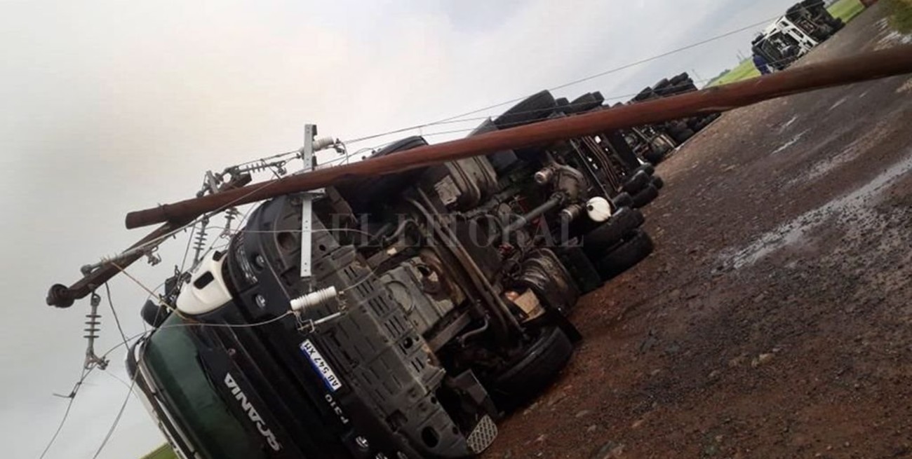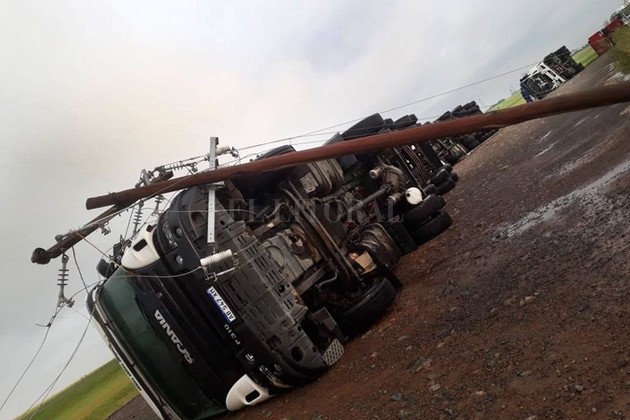 El propietario agregó que el viento derribó columnas de alta tensión y postes de luz. "Hay tres columnas tiradas, los postes del cableado impactaron contra el camión y se produjo un chispazo a raíz de eso; esperaron todos dentro de la cabina", agregó.