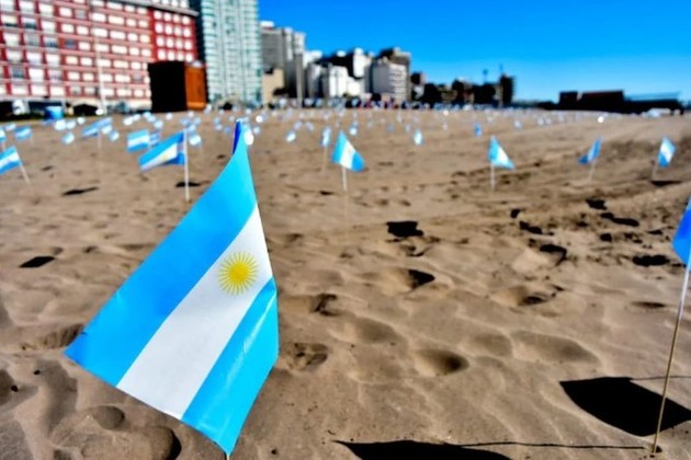 Un grupo de vecinos colocó en las últimas horas 504 banderas argentinas en la playa en homenaje a los fallecidos en lo que va de la pandemia de coronavirus en Mar del Plata y para mostrar la crítica situación en que se encuentra el distrito.