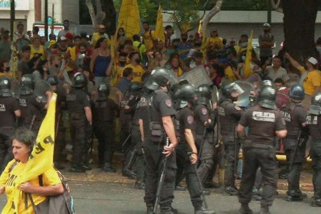 Por consecuencia de este accionar policial se generaron disturbios entre los miembros de la fuerza y un grupo de violentos del MIDJ que intentaron desarmar el cordón formado por policías y arrojaron diferentes tipos de proyectiles. Como respuesta, se arrojaron gases lacrimógenos.