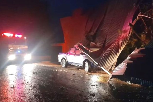 Además se reportaron varios destrozos en la vía pública, como la voladura de techo en el predio municipal de Los Reartes y la destrucción de una camioneta de la Policía que terminó aplastada por los escombros.