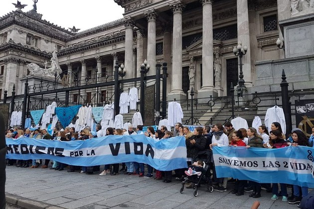 Unos 80 profesionales de la salud, acompañados por algunos familiares, posaron frente al Congreso con pañuelos celestes, delantales blancos y carteles en rechazo a la Interrupción Voluntaria del Embarazo (IVE), que ya cuenta con media sanción en Diputados. “Legal o ilegal, el aborto mata igual”, decía una de las pancartas.