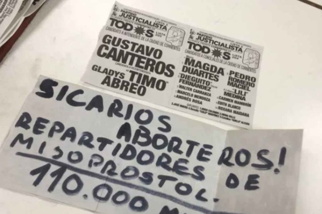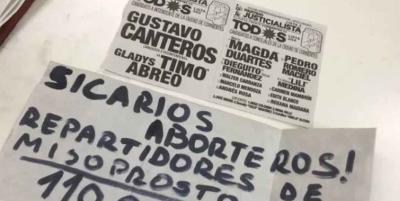 En la escuela Remedios de Escalada, en el dorso de las boletas justicialistas los fiscales y autoridades de mesa se encontraron con la leyenda: “Sicarios abortadores. Repartidores de misoprostol. 110.000 muertes”.