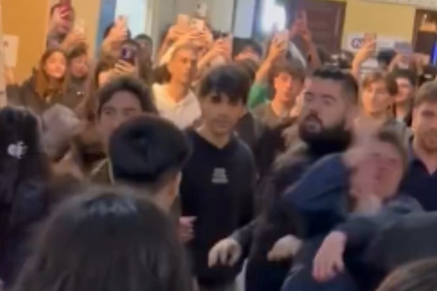 Las imágenes del altercado viralizaron rápidamente. Se observa a estudiantes abrazados en empujones, otros dando golpes, banderas agitándose como estandartes de conflicto..