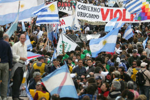 Una multitud marchó ayer hasta el puente General San Martín, en el sexto "Abrazo al río Uruguay" convocado por la Asamblea Ambiental de Gualeguaychú, durante el cual ratificó la continuidad de la lucha hasta el retiro de la pastera UPM y advirtió al Gobierno que el fallo de la Corte de La Haya "no soluciona el conflicto" con el vecino país.