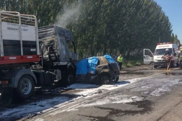 Fue allí donde, por razones que aún se intentan establecer, un auto Toyota Etios y un camión que trasportaba una jaula con vacas impactaron de lleno sobre la cinta asfáltica. Luego, el rodado menor se prendió fuego y las llamas también alcanzaron al segundo rodado.