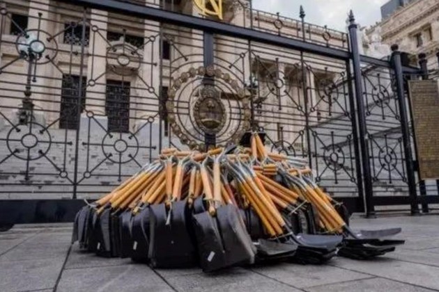 Un influencer y empresario simpatizante de Javier Milei dejó este jueves por la tarde 256 palas negras con mango de madera en la puerta del Congreso de la Nación y las imágenes se viralizaron en redes sociales.