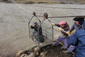 Con roldanas y cables se tendió, donde estaba el puente, una guía por la que -como en una tirolesa- se desplaza una celda metálica. A ella deben subirse los vecinos, con sus bolsas y mascotas, que quieran regresar a su casa.