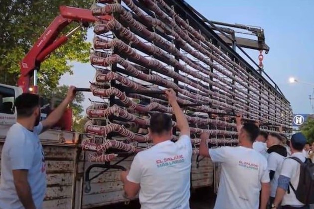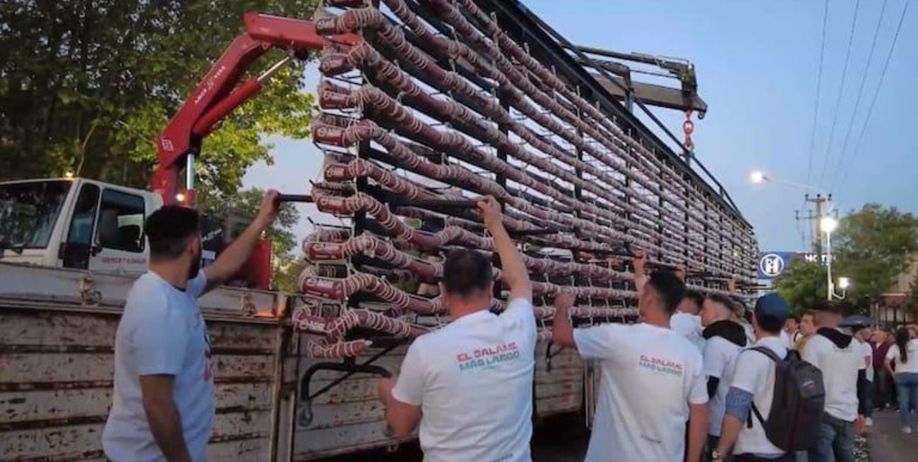 Este salame midió 310,69 metros y para elaborarlo se utilizaron cientos de kilos de carne porcina e intervinieron más de 100 personas contando todas las etapas del proceso de elaboración que incluye la fase de embutido, estacionamiento, traslado al predio ferial y degustación en el evento.