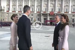 Macri y el rey Felipe V pasaron revista a una compañía de honores de la Guardia Real y saludaron a la bandera de España. A su lado, desfilaron la reina Leticia que lucía un trajecito rosado y Awada, que llevaba un abrigo del mismo tono.