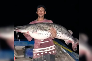 Un pescador de Diamante, provincia de Entre Ríos, compartió a través de los medios de la región lo que sacó del Río Paraná: un surubí gigante, de unos 40 kilos, según sus estimaciones.