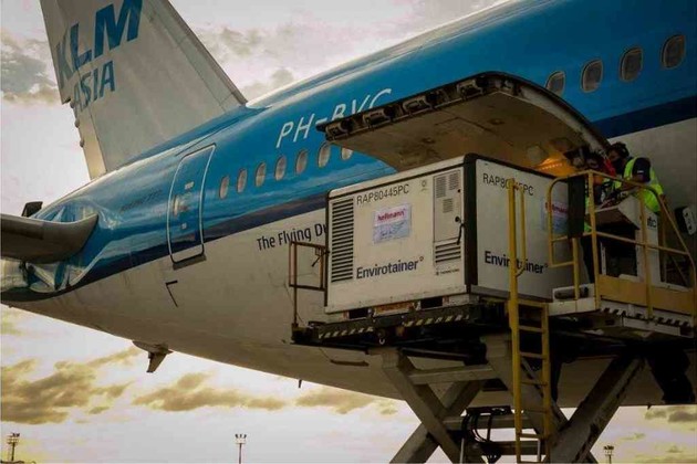 Las 96.000 dosis fueron cargadas en dos contenedores Envirotainers RAP E1 de temperatura controlada. El rango de temperatura es +2 +8°C.