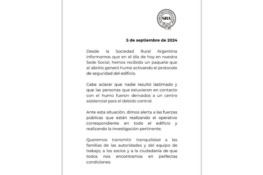 “Desde la Sociedad Rural Argentina informamos que en el día de hoy en nuestra Sede Social, hemos recibido un paquete que al abrirlo generó humo activando el protocolo de seguridad en el edificio”, comienza el escrito.