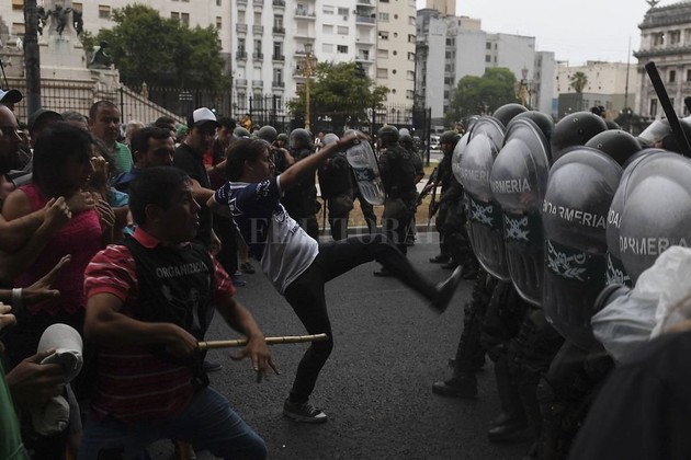 Mientras se espera la sesión especial convocada por el oficialismo para tratar la reforma previsional, afuera del Congreso se enfrentan manifestantes con efectivos de la Gendarmería. El grueso de la manifestación que se acercó hasta el vallado dispuesto por las fuerzas de seguridad se cruzó la policía, que entre piedrazos y botellazos, respondió con balas de goma y tiró agua desde el camión hidrante para despejar el lugar.