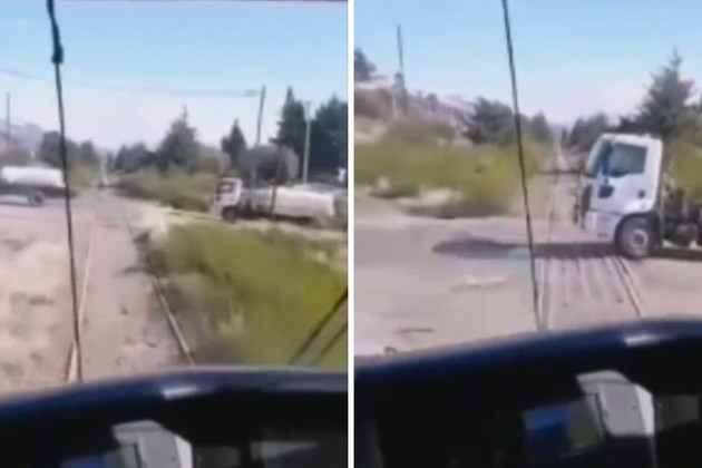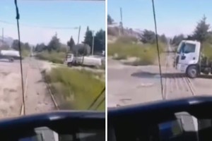 El material, tomado desde la cabina del maquinista, muestra cómo los camiones no se detienen pese a la marcha sostenida del tren que se aproxima hacia esa dirección.