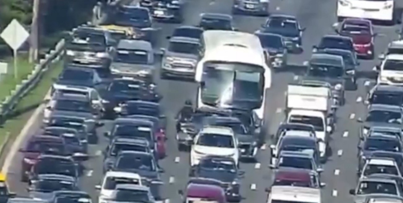 Una cámara de seguridad ubicada sobre la avenida General Paz del la ciudad de Buenos Aires registró el momento del brutal choque múltiple entre nueve autos y un micro sin pasajeros.