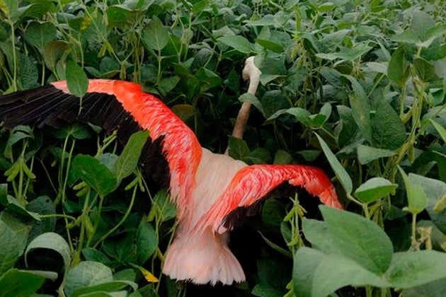 “Cansado bajo en la soja y quedó enredado”, publicó el Ingeniero Agrónomo cordobés y compartió una foto del flamenco.
