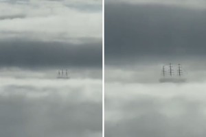 La particular escena presenta a la fragata ARA Libertad (Q-2) atravesando la niebla del mar Argentino, la cual se fundió con el horizonte y el agua, provocando el efecto de vuelo del barco sobre las nubes.