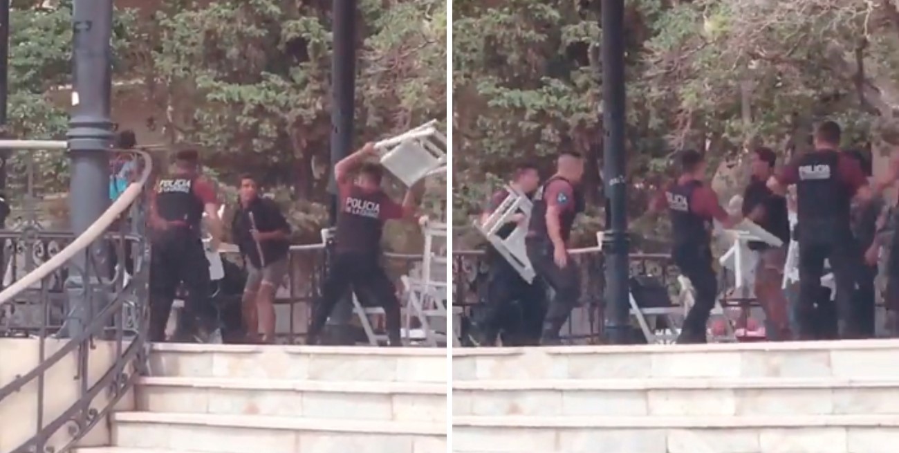 El hecho ocurrió en las últimas horas y en redes sociales testigos del momento grabaron la secuencia, que parece de película, y de forma inmediata se hizo viral. Allí se observa como efectivos de la Comisaría Vecinal 13A tratan de reducir al sujeto golpeándolo con sillas de plástico hasta que logran detenerlo.