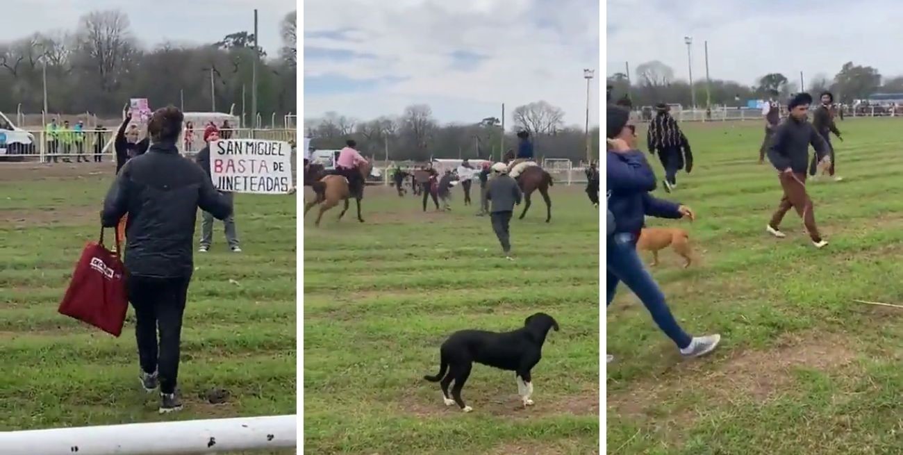 Los manifestantes, en su mayoría mujeres, ingresaron este domingo al predio donde se desarrollaba el evento con carteles que decían "San Miguel, Basta de Jineteadas" o "Liberación animal", frente a la cual jinetes a caballo y también de a pie los atacaron con rebenques para dispersar la protesta.