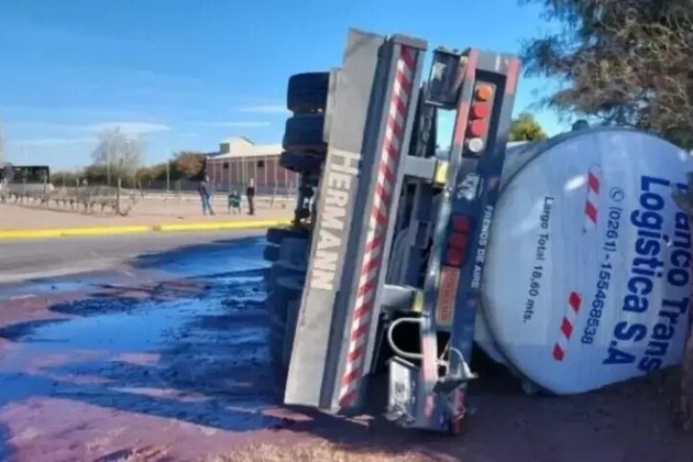 Un camión tipo cisterna que trasladaba 25 mil litros de vino por la localidad de Los Barriales, en Junín, provincia de Mendoza, quiso pasar una rotonda y volcó al tratar de esquivar otro auto derramando la bebida por todo el asfalto.