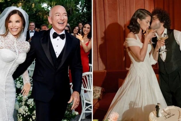 Lauren Sánchez-Bezos y Jeff Bezos; Selena Gómez y Benny Blanco en sus respectivas bodas.