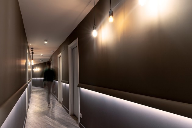 La iluminación estratégica aporta amplitud y calidez a los pasillos.