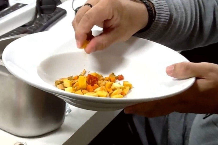 Pero lo más avanzado llegó con la liofilización, técnica utilizada para conservar alimentos sin refrigeración, especialmente para astronautas y andinistas. Exhibiendo un ejemplo claro, mostró un envase de pocos gramos: "esto es una comida completa, un pollo a la portuguesa, que no pesa nada".