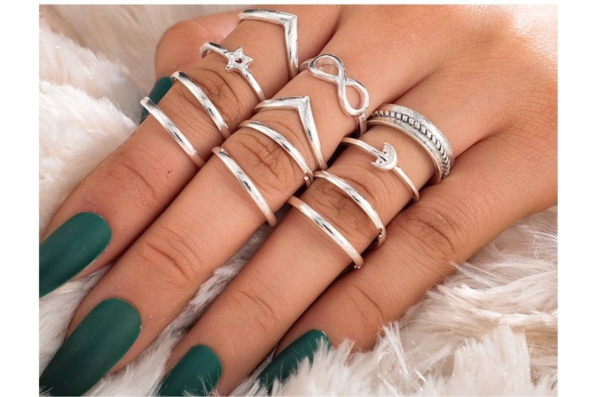Entre las formas más populares está el estilo minimalista, que utiliza anillos finos y delicados apilados con armonía, creando un look elegante y discreto. Por otro lado, está la opción maximalista, que combina anillos gruesos, con diseños llamativos y piedras decorativas para un efecto más potente y moderno.