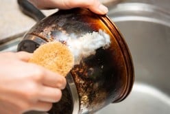 Frota suavemente con una esponja o cepillo para eliminar la suciedad. La acción abrasiva del bicarbonato y la capacidad de blanqueo del peróxido hacen que sea más fácil eliminar las manchas persistentes.