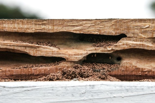 Daños visibles en la madera causados por una infestación de termitas.
