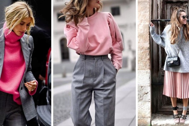 Una falda plisada en rosa con un suéter gris es un look súper trendy.