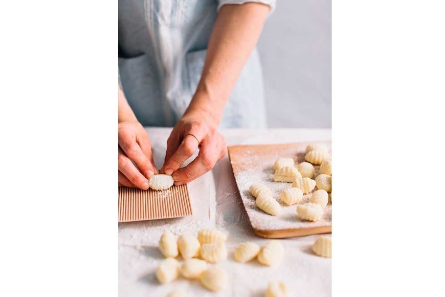 Ahora viene la magia, vamos a pasarlos por la herramienta para darle forma a los ñoquis de papa de arriba hacia abajo. También pueden usar un tenedor enharinado que también les deja una forma similar. Colocarlos en una placa enharinada sin que se toquen para que no se pegoteen. Y claro, también pueden hacerlos sin la herramienta y simplemente que queden en su versión más rústica.