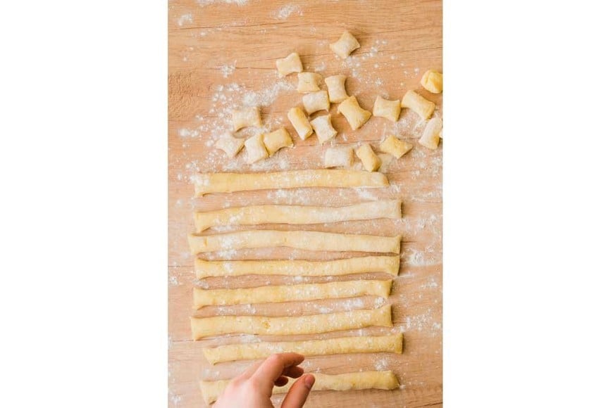 Cortar tiras de masa y hacer chorricitos o rollitos, y cortar trocitos de unos 2 o 3 cm de ancho, pueden enharinar el cuchillo para que sea más fácil.