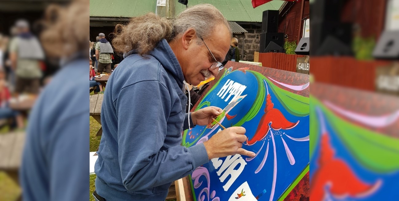Alejandro Di Rosa es el creador del artístico y singularísmo mate con el que se acompaña Gustavo cuando compone. Y lo exhibe orgulloso. El reconocido fileteador es argentino pero no vive en el país; vive en Suecia y transita por distintas partes del viejo continente. Aprendió el idioma local de manera algo forzada, cuando llegó a esas tierras luego de un interesante periplo. Es que nació en 1963 en San Martín, provincia de Buenos Aires, y Hurlingham fue su siguiente destino. Luego se recibió de Maestro Mayor de Obras y siguió viaje rumbo a Esquel, donde trabajó como plomero y gasista.