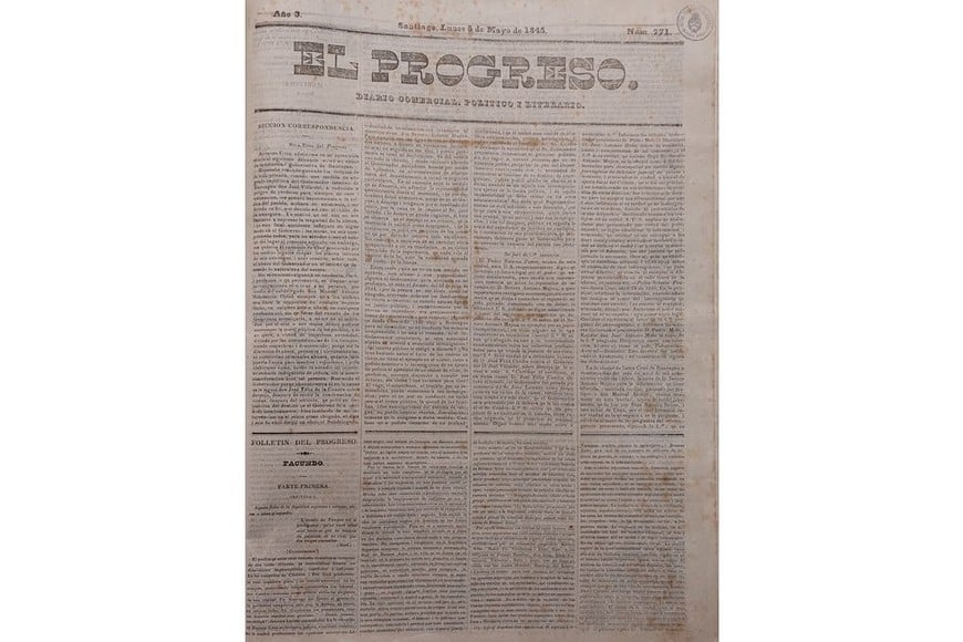 Ejemplar de El Progreso, "diario político, comercial y literario" chileno, en cuyas páginas eran plasmadas las entregas con la historia de "Facundo", de Domingo Faustino Sarmiento. Edición del lunes 5 de mayo de 1845..