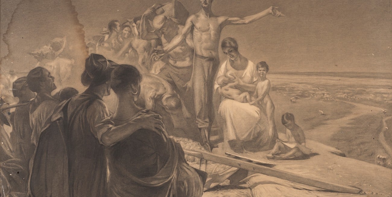 Para transmitir este mensaje el artista apela a una composición de tres planos. El primero: una familia (de espaldas) llega y es recibida por un grupo de personas (segundo plano). Detrás de ellos, el paisaje. La pampa. Vamos ahora a un análisis de la obra en su conjunto. A esa familia la recibe un grupo de gente (segundo plano) en el cual se agolpa pasado, presente y futuro.
