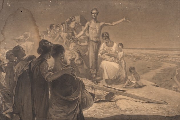Al final un cuerpo inclinado quizá esquilando una oveja, un hombre con un cajón al hombro y torsos "en cuero" que hablan de un país (aún inexistente) forjado por el trabajo de generaciones.