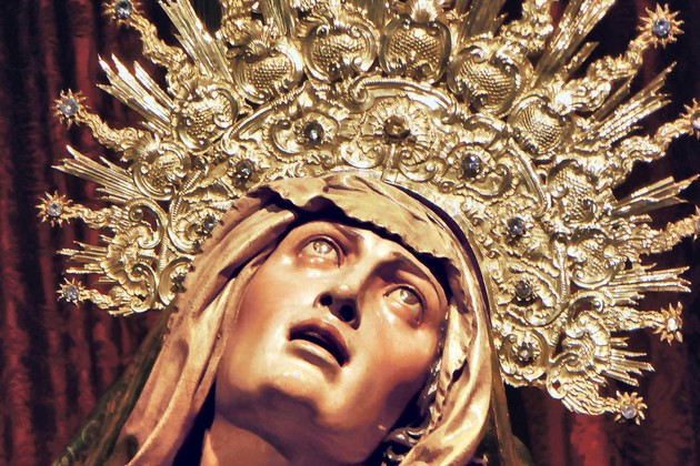 Los movimientos de las figuras de gran tamaño, torsionadas, flexionadas, agobiadas por el dolor, componen una escena de abrumadora teatralidad. Pero prefiero singularizar todos esos sentimientos en una sola pieza, la de Nuestra Señora de las Angustias, imagen mayor de la iglesia vallisoletana a la que le da nombre.