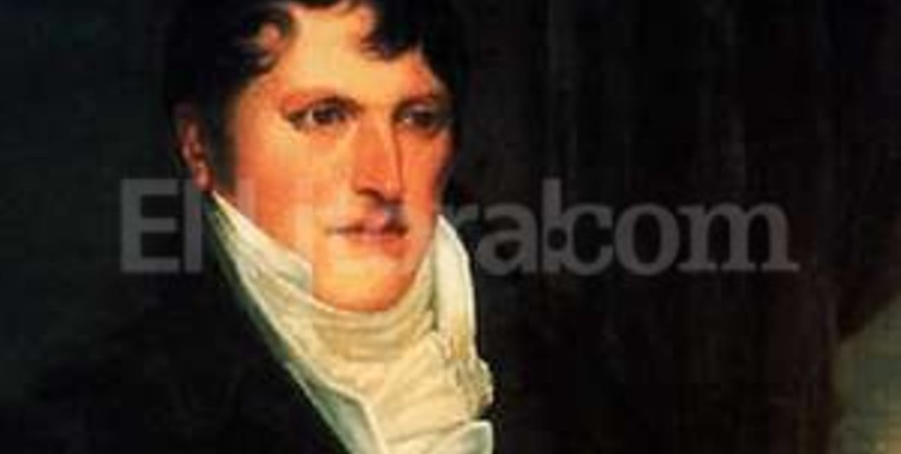 En Europa. Cuadro pintado en 1815 por Francois-Casimir Carbonnier, discípulo de Ingres, durante la misión diplomática de Belgrano en Londres. A través de la ventana, en el campo de batalla, se observan, aunque con dificultad, enseñas patrias con dos franjas: celeste y blanca. Foto: Museo Municipal de Artes Plásticas Dámaso Arce de Olavarría