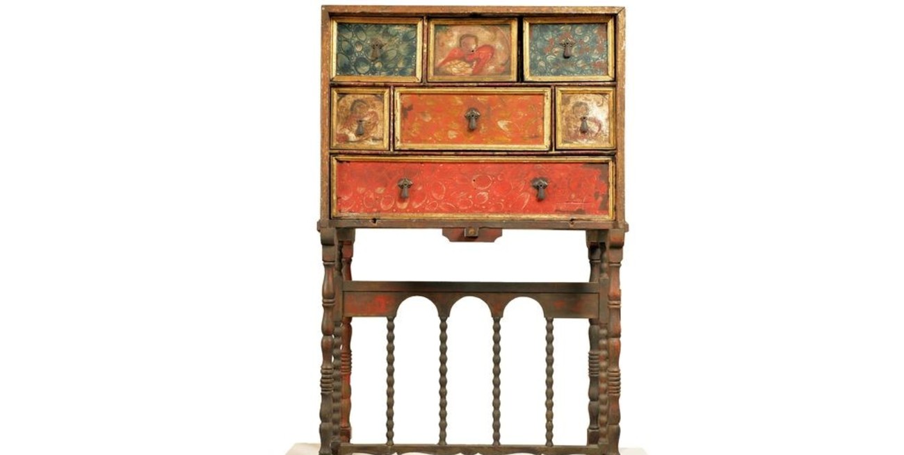 Vista frontal del bargueño de hispano origen y americanizada ejecución, en la que se conjugan la carpintería, la escultura y la pintura. José G. Vittori / Museo Histórico Provincial