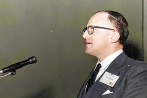 Enrique Shaw durante su exposición en Santiago de Chile en 1961, en el XI Congreso Mundial de Empresarios Cristianos.